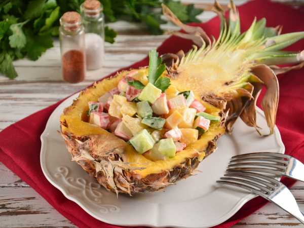 У консервированных ананасов перед тем, как они попадут в салат, важно слить жидкость.