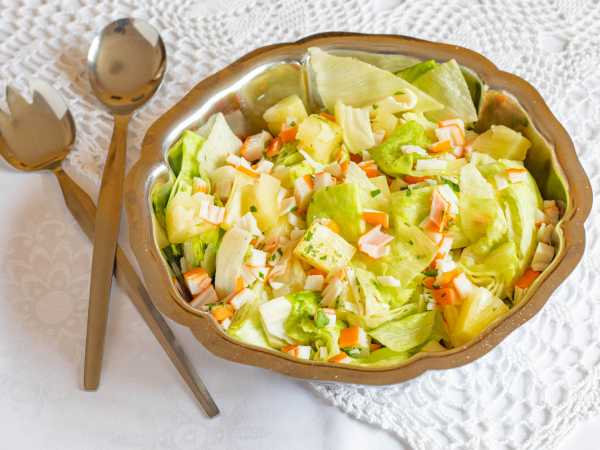Ну, в общем-то, а теперь все ингредиенты нужно только соединить, помаслить, капельку посолить и перемешать. Салат айсберг с крабовыми палочками и ананасом готов. Для весны - просто то что надо!