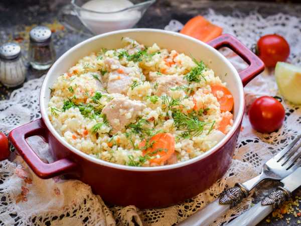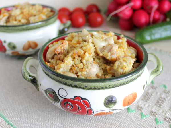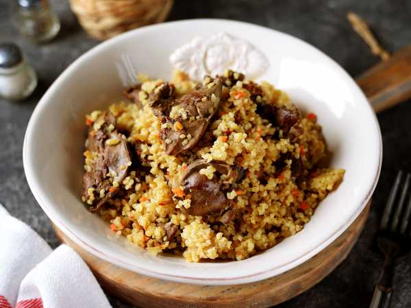 Перед подачей выловите и выбросьте чеснок, разложите куриные сердечки с грибами и булгуром по порциям и подавайте к столу.