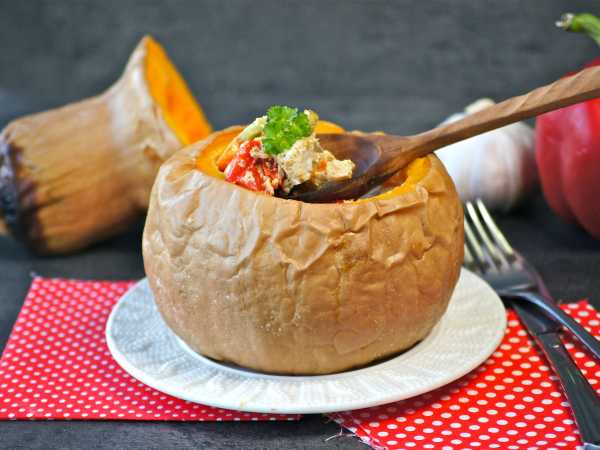 Ставим на противень, закрываем тыквенной крышечкой и оборачиваем сверху также фольгой. Печём при 200-220 градусах 1,5-2 часа. Проверяем готовность тыквы ножом. Если легко протыкается, а мякоть отходит от кожуры - готова!