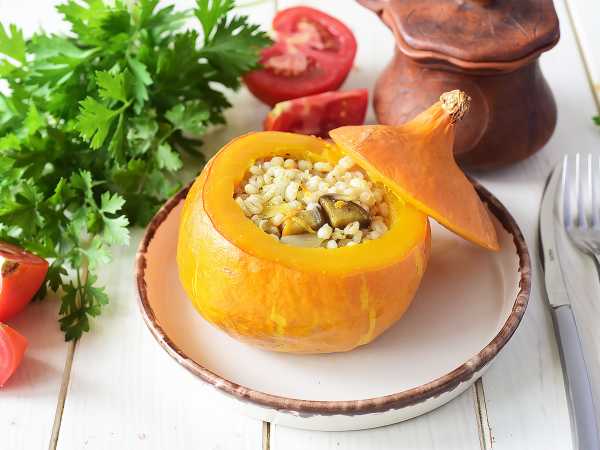Снизу тыкву оборачиваем фольгой и фаршируем подготовленной кашей. Сверху кладём добрый кусок сливочного масла.