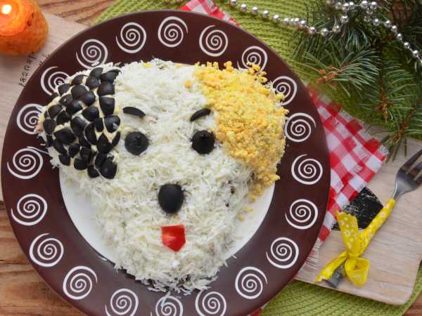 Приложить уши и морду из вырезанных кусочков колбасы. Маслины разрезать пополам и сделать ноздри, глаза и ресницы.