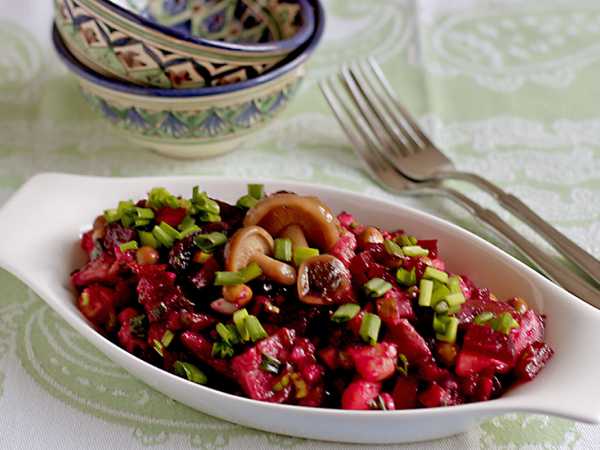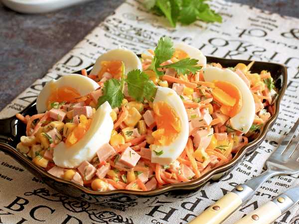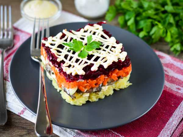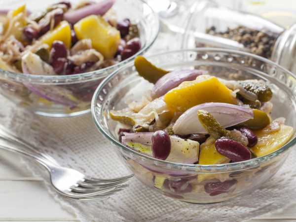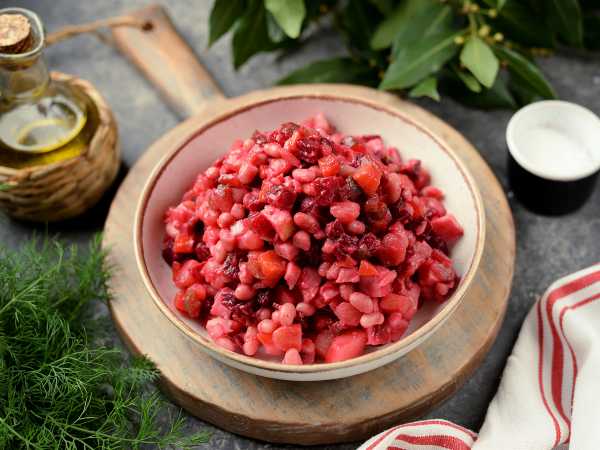 Картофель и морковь очистить и нарезать кубиками, добавить к остальным ингредиентам. Салат посолить и поперчить.