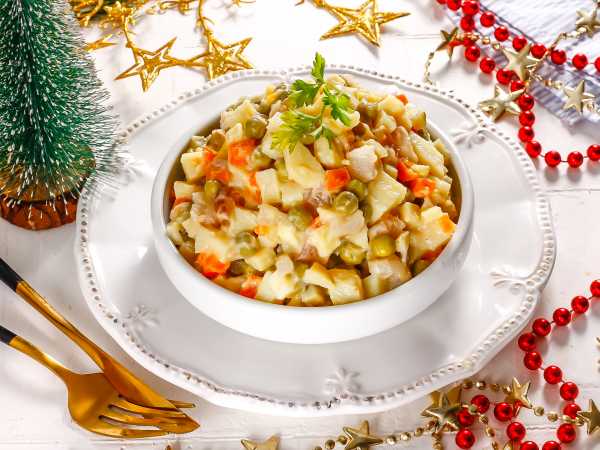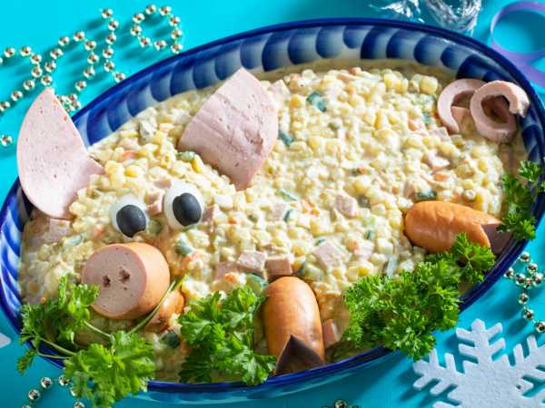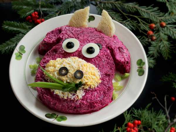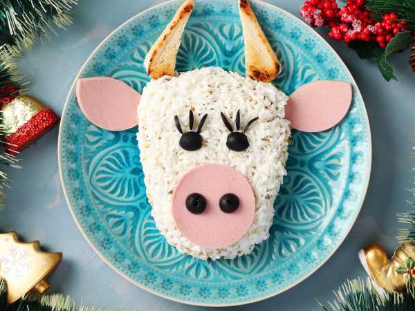 Ну вот и всё. Новогодний салат Оливье в форме бычка готов для праздничной подачи.