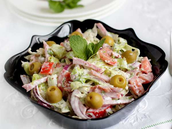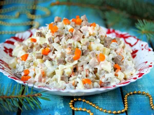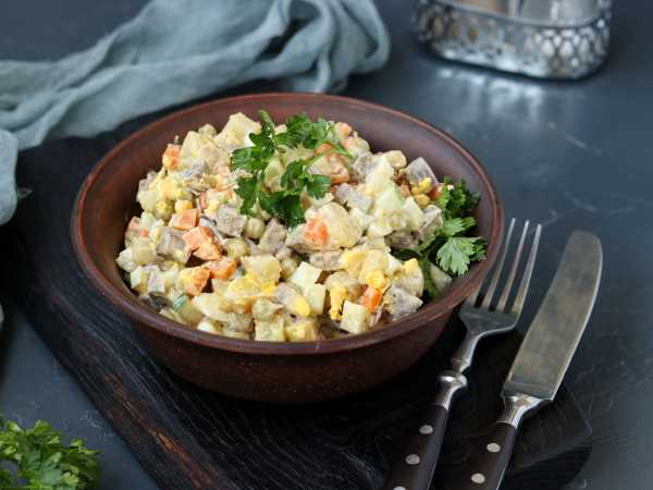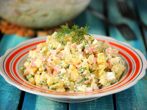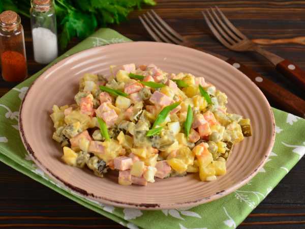 Добавить в оливье заправку и тщательно перемешать. По желанию можно добавить консервированный горошек, но я в этот раз готовила без него. В принципе, салат уже готов.