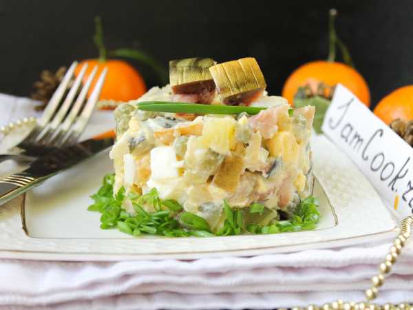 Для приготовления салата Оливье в форме бычка подготовить из списка необходимые ингредиенты. Овощи и яйца сразу поставить варить или сделать это заранее.
