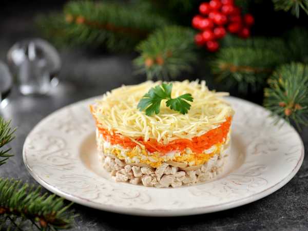 Возьмите необходимые ингредиенты для приготовления салата в виде мандарина на Новый год (с курицей). Заранее отварите морковь и куриное филе, затем остудите их.