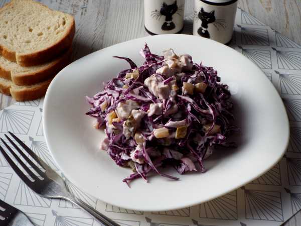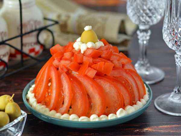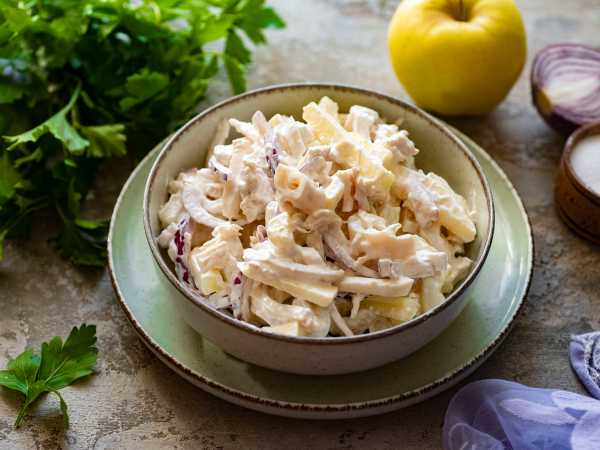 Сверху салата выложите остывших креветок, посолите и при желании чуть поперчите.