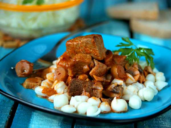 Затем положите в сотейник оставшееся мясо и полейте оставшимся соусом. Влейте 100-150 мл воды и томите луковый клопс из свинины на слабом огне минут 15.