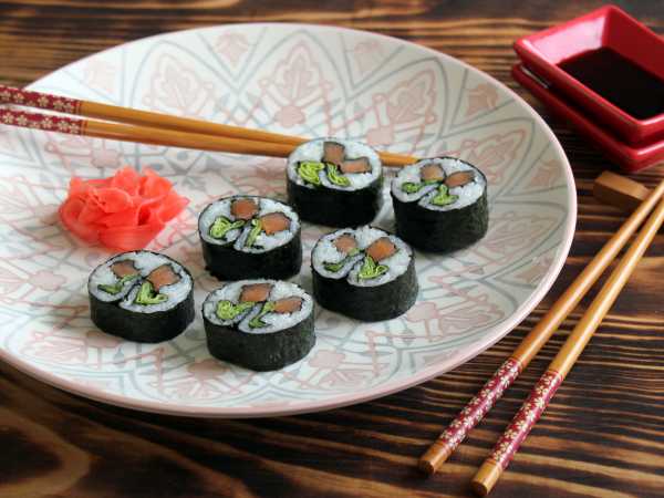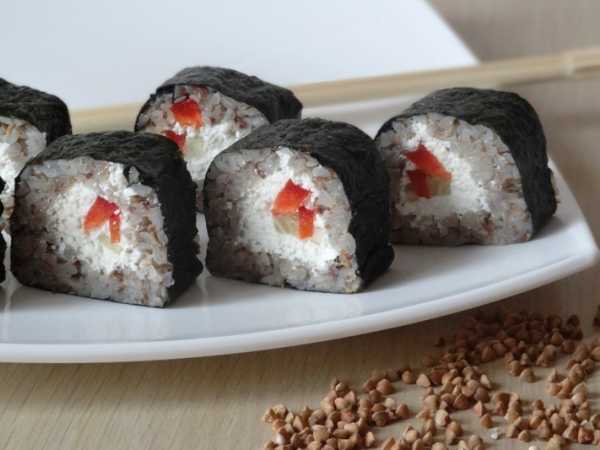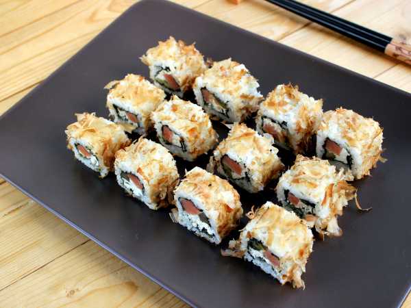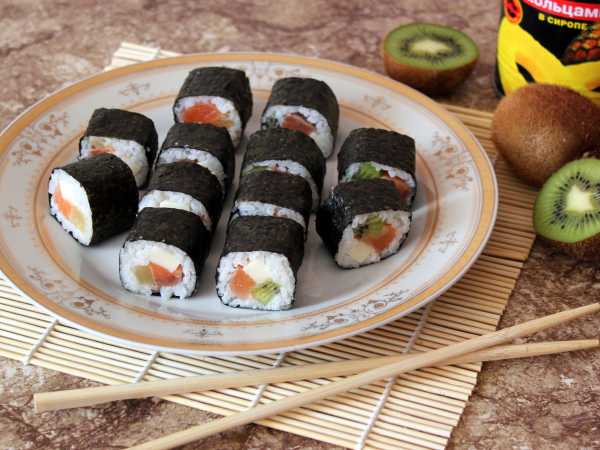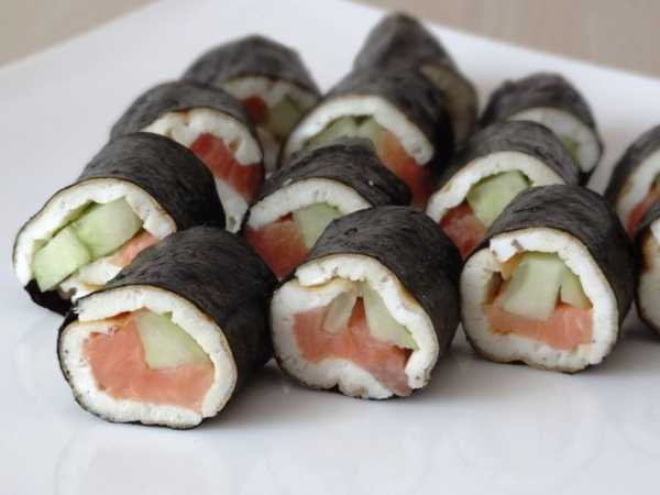 То же самое проделайте с остальными продуктами. Советую блюдо с роллами держать под пищевой пленкой, поскольку бумага достаточно быстро заветривается.