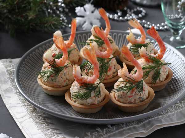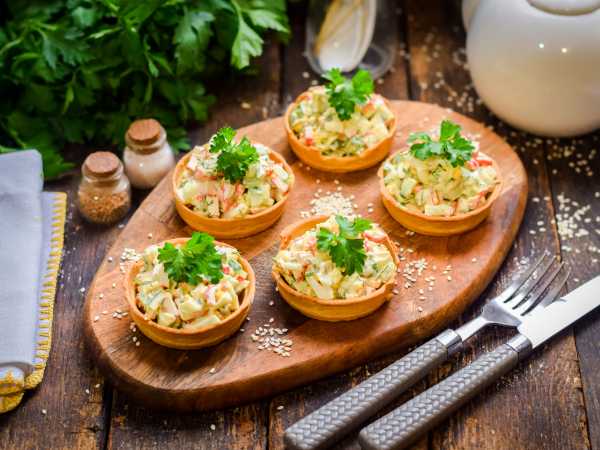 Тарталетки с печенью трески, яйцом и твердым сыром готовы к подаче.