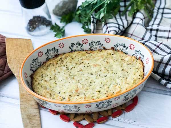 Заполненную таким образом форму поставить запекаться в заранее разогретую до 180 градусов духовку на 40-45 минут. Показателем готовности запеканки будут неподвижные слои при легком нажатии пальчиком.