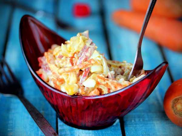 Для приготовления салата нам понадобится копчёная колбаса, яйца, морковь, лук, консервированная фасоль, чеснок и растительное масло.