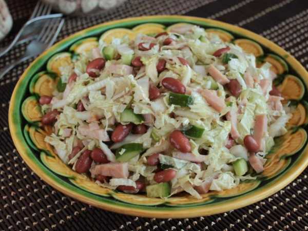 Салат с копчёной колбасой и фасолью - очень сытный, особенно он должен понравится сильной половине. Этот салат можно подать в двух вариантах. Если его подавать сразу, то все составляющие следует смешать с майонезом. Если майонез исключить, то салат следует настоять в холодильнике 6-7 часов. В обоих вариантах это очень вкусно, но во втором более полезно.