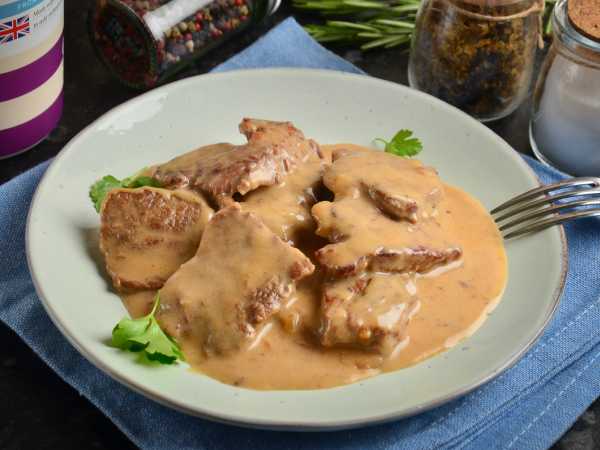 Выложить мясо на разогретую сковороду с растительным маслом. Быстро обжарить на сильном огне до образования золотистой корочки. Затем добавить нарезанный полукольцами лук и столовую ложку пшеничной муки. Готовить всё вместе пару минут, помешивая.