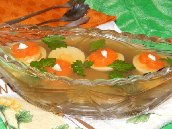 Влейте бульон с желатином в форму. Отправьте заливное застывать в холодильник.