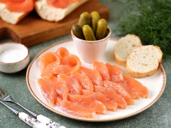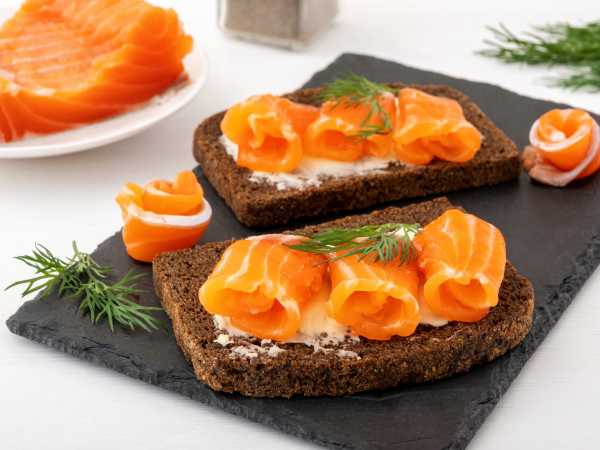 Украсьте закусочные пирожные ломтиками слабосоленой красной рыбы и свежей зеленью.