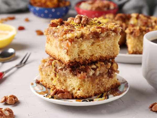 Одну половину теста посыпьте ореховой начинкой, а на вторую часть нанесите вторую начинку из мака, изюма орехов и яблок.