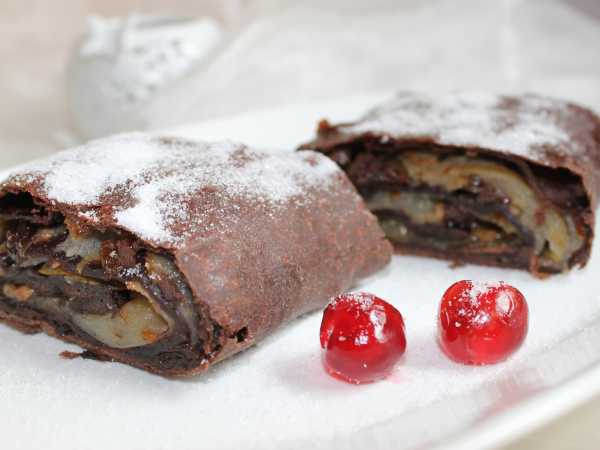 Тесто с ореховой начинкой скрутите в рулет по длинной стороне, а тесто с сочной начинкой скрутите в рулет по короткой стороне.