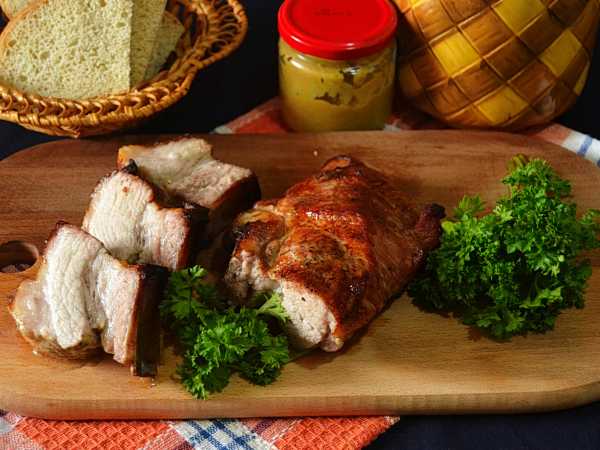 Слегка смажьте куски свинины приготовленным соусом из горчицы и майонеза, отправьте в предварительно разогретую до 180 градусов духовку под верхний гриль на 15-20 минут.