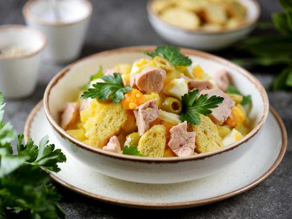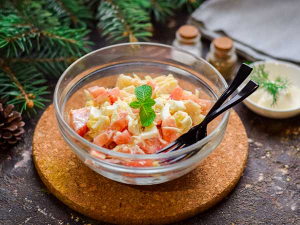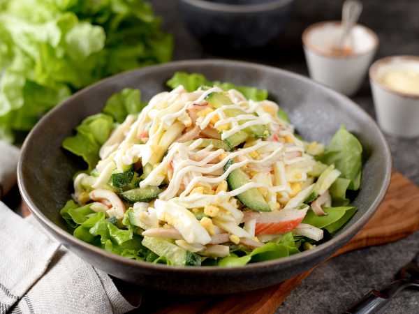 Перемешайте. Соуса не жалейте - салат должен стать сочным, так как в нем много сыра и яиц, а они суховаты и их нужно хорошо сдабривать майонезом.