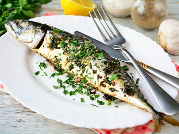 Переложите готовую скумбрию на красивое блюдо и подайте ее к столу.