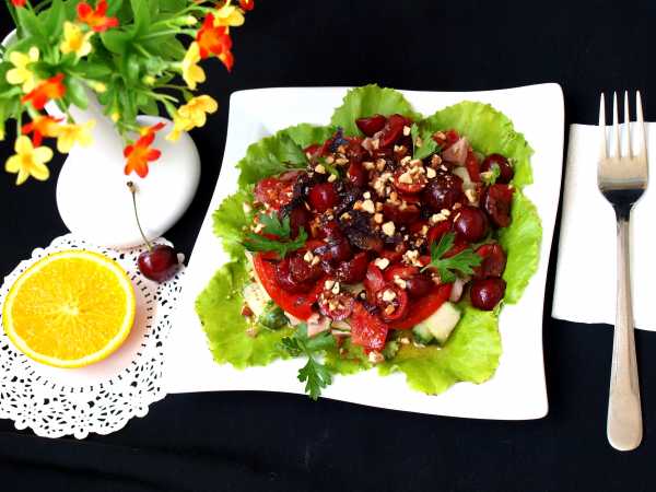 Вкусный и легкий салат готов. Переложите его в салатницы и посыпьте оставленными для украшения грецкими орехами.