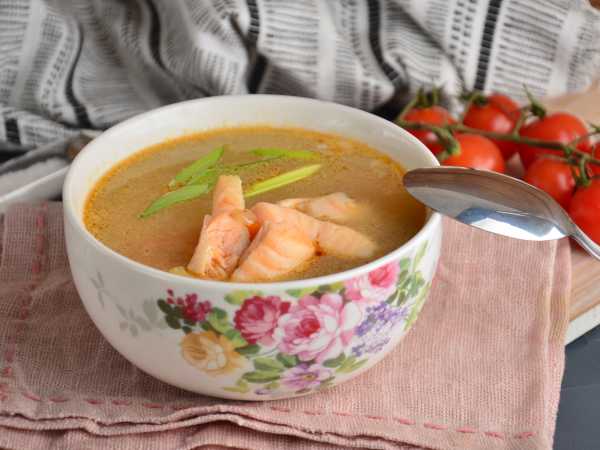 Разлейте ароматную и жирную уху из головы горбуши с рисом в глубокие тарелки или пиалы, подайте к столу горячей.