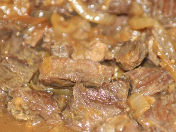 Про лук. Традиционно для говядины по-бургундски используют лук-шалот и тушат его вместе со всеми ингредиентами. Предлагаю другой - интересный вариант! Половинки обычного репчатого лука обжарьте и потомите минут 15-20 на сливочном или смеси сливочного с растительным масел, например, у мультиварке. Слегка посолите, а по желанию воткните в лук соцветия гвоздики. Затем добавьте этот лук в сотейник/сковороду к мясу или подавайте потом уже вместе с готовой говядиной.