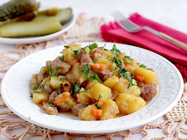 Верните на сковороду к овощам мясо и бекон. Кстати, на протяжении всей готовки не солю, т.к. бекон – продукт солёный. Но потом готовое блюдо каждый может досолить на свой вкус.