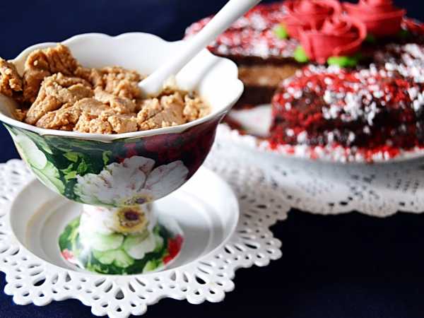 Собираем торт, прослаивая каждый корж нашим кремом «патисьер». Сверху тоже смажем кремом и присыпем крошкой. Поставим в холодильник на сутки.