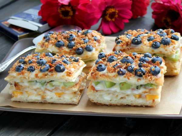 Подготовим ингредиенты для торта и для крема. Мы используем готовое слоеное тесто. Можете приготовить тесто самостоятельно, рецепт есть на нашем сайте - ЗДЕСЬ.