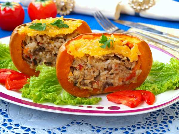 Закрываем нашу тыкву "крышечкой" и плотно оборачиваем фольгой. Отправляем тыкву, фаршированную мясом, в духовку, разогретую до 200 градусов, на 1,5 часа. В зависимости от духовки, времени может уйти чуть больше или чуть меньше. Чтобы проверить готовность тыквы, слегка разверните фольгу и проткните шкурку овоща зубочисткой. Если прокалывается легко, то фаршированная тыква готова.