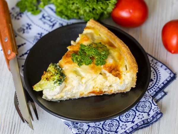 Готовый киш с грибами и брокколи полностью охладим и только тогда приступим к нарезке на порционные кусочки.