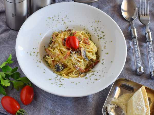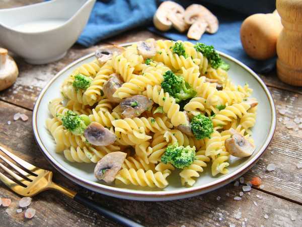 Как только сливки начнут густеть, переложите в соус макароны, перемешайте, посолите и поперчите.