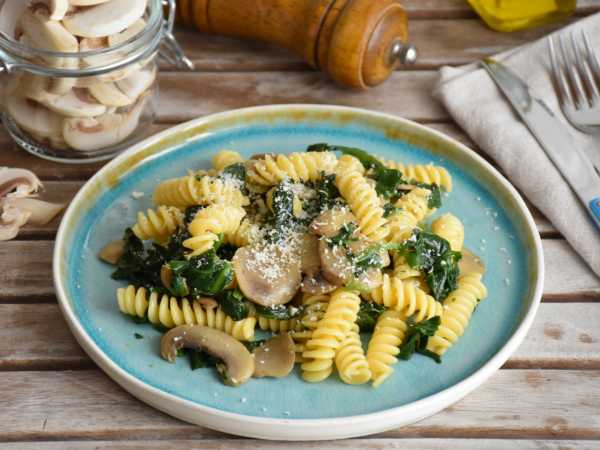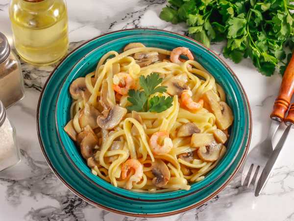 Готовую пасту с вешенками в сливочном соусе разложите по порционным тарелкам и сразу же подавайте к столу.