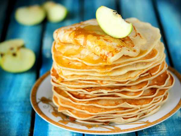 Жарьте постные яблочные блины на раскалённой блинной сковороде с антипригарным покрытием, слегка смазывая её маслом после каждых 2-3 блинчиков.