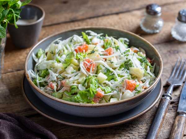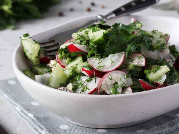 Поместить салат с редиской, капустой и яйцом в удобный салатник и подать к столу.