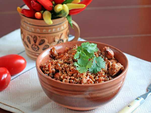 Переложите гречку в любую удобную огнеупорную форму, удалите весь мусор, тщательно промойте несколько раз, слейте всю воду. Добавьте к крупе обжаренные овощи, посолите и поперчите по вкусу, перемешайте.