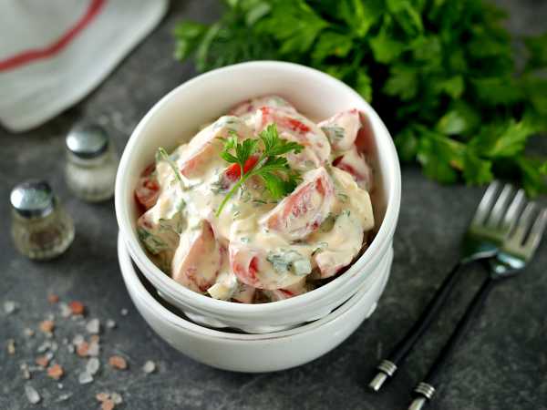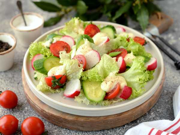 Подать вкусный овощной салат с яйцами, редиской, огурцом и помидором к столу.