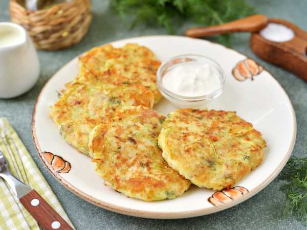 Готовые кабачковые оладьи с колбасой и сыром подать к столу со сметаной.