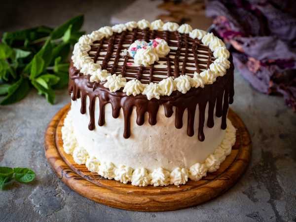 Снимите с торта кольцо и выровняйте торт сверху и по бокам подготовленным кремом. Украсьте торт на свой вкус.