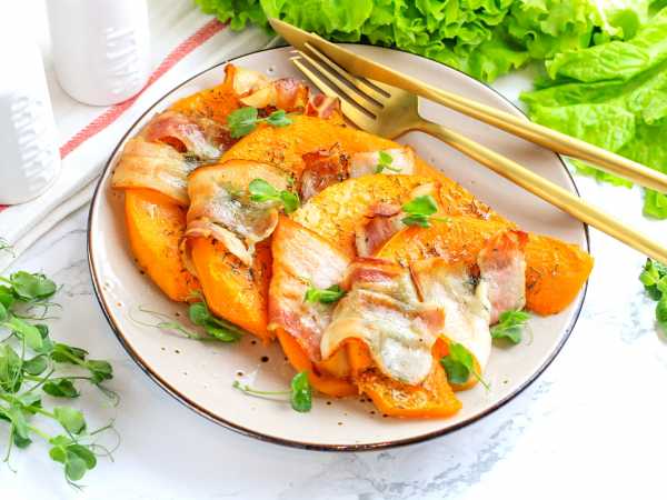 Готовую фаршированную тыкву с перловкой и овощами выложим на порционные тарелки, подаем к столу в горячем виде.