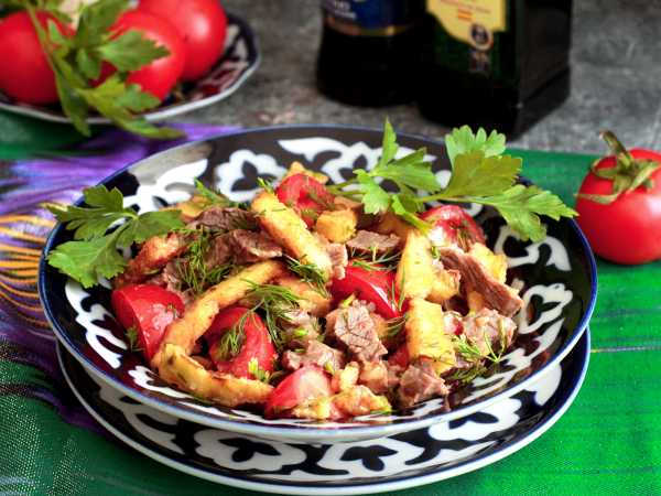 Салат аккуратно перемешать. Лучше это делать щипцами или при помощи двух вилок. Если мало соли, то на этом этапе её можно добавить. Дать салату полностью остыть, а затем хотя бы на час убрать в холодильник, чтоб он настоялся.