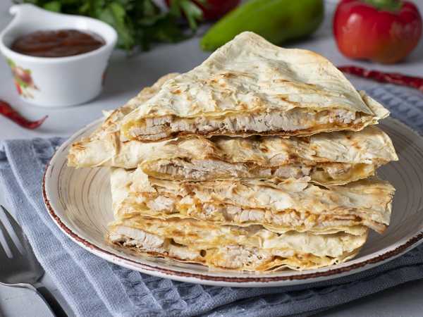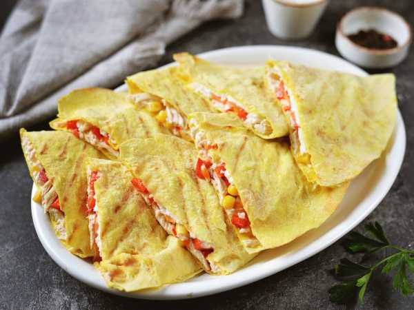 Приготовьте таким образом все порции. Готовые кесадильи с курицей и кукурузой разрежьте пополам и подавайте к столу. Приятного аппетита!