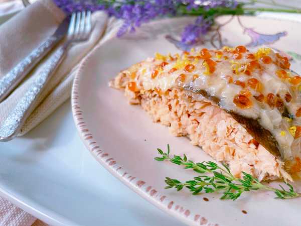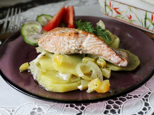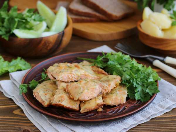 Запеченная в духовке горбуша под маринадом из моркови и лука готова. В идеале - полностью остудить, затем убрать в холодильник на пару часов. Но и в горячем виде будет вкусно.