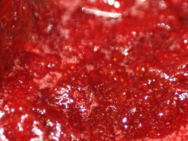 Вот так выглядит готовое охлажденное варенье из клубники и черной смородины: заметна его густота. Я его раскладываю в сухие чистые баночки, когда оно остынет.