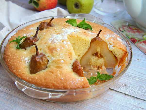 Отправьте форму в духовку на 30-35 минут. Готовность пирога проверьте деревянной шпажкой, проткнув ею выпечку насквозь. Если шпажка выйдет сухой, значит, пирог с карамелизированными грушами полностью готов и можно выключить нагрев.