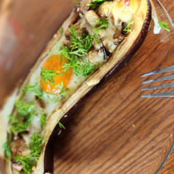 Затем извлеките баклажаны из духовки и аккуратно в каждый баклажан вбейте по 1 яйцу, слегка посолите. Чтобы яйцо не вытекало из половинки баклажана (как у меня), сделайте небольшое углубление в начинке. Также очень важно, чтобы баклажаны были побольше, а яйца - маленького размера. Или ещё как вариант, можно в каждом яйце отделять белок от желтка и выкладывать по отдельности желток и белок, только белок не весь, т.к. его обычно очень много и именно он и вытекает.