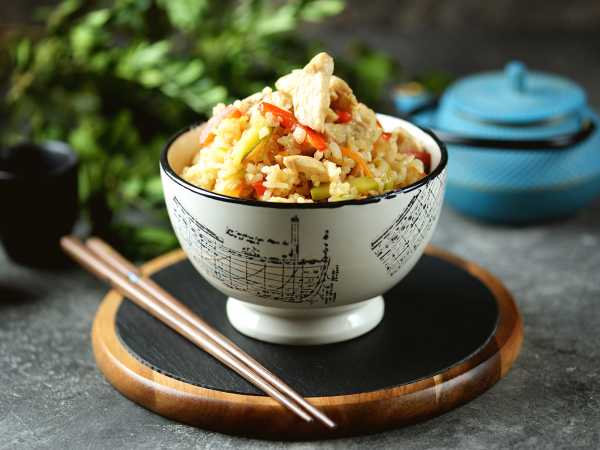 Когда рис будет готов, переложите в сковороду курицу и грибы.